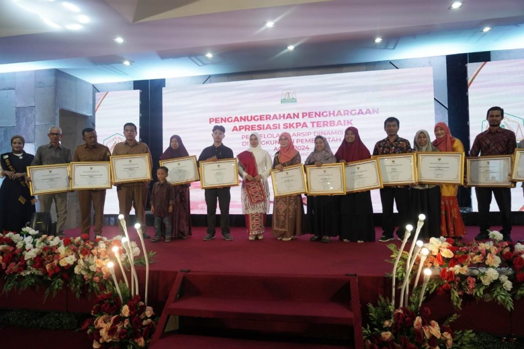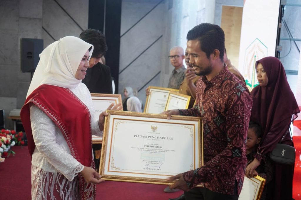 Direktur penerbit Suffah, Syah Reza Ayub menerima Piagam Penghargaan dari Pemerintah Aceh untuk kategori penerbit prestasi ‘Penyerahan KCKR’ Dinas Arsip dan Perpustakaan di Perpustakaan Wilayah Aceh, Selasa, 5 November 2024. Piagam tersebut diserahkan oleh Ibu Literasi Aceh, Ny. Safriati yang juga merupakan istri dari Pj. Gubernur Aceh, Syafrizal ZA. Foto Hendri Abik
